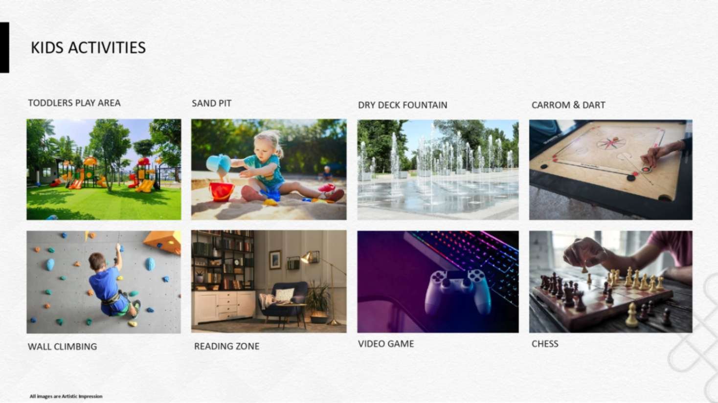including a reflexology park, banquet spaces, sports facilities, party grounds,